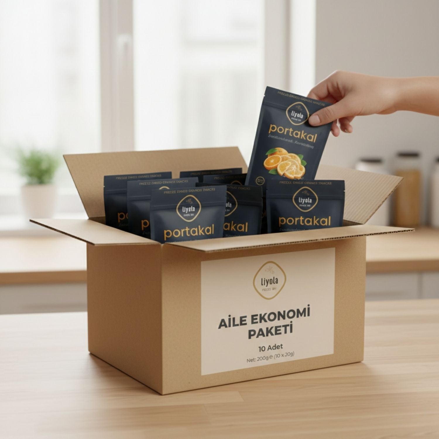 20 gramlık porsiyonluk paket, yaklaşık 200 gram taze portakaldan üretilmiştir. Kilitli ambalajı sayesinde ağzı kapalı kaldığı sürece uzun süre tazeliğini korur.